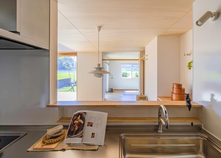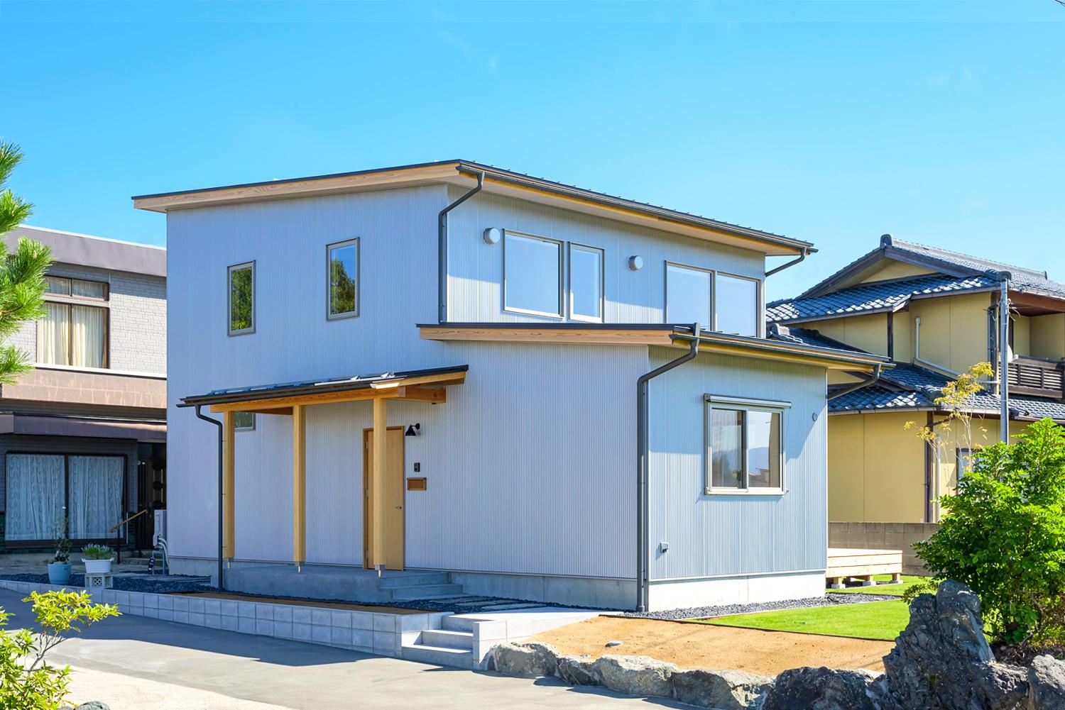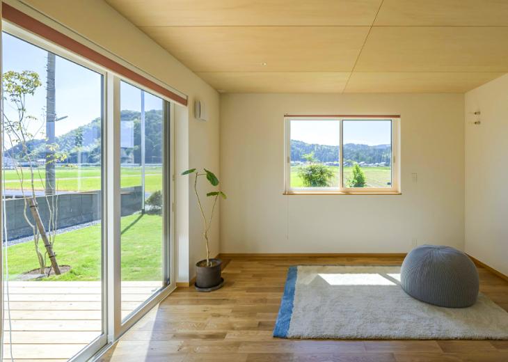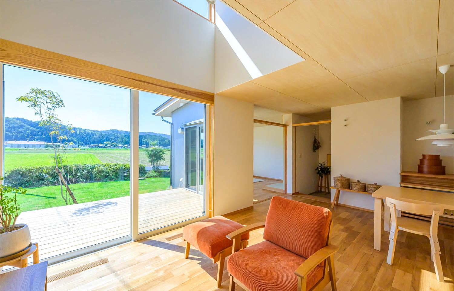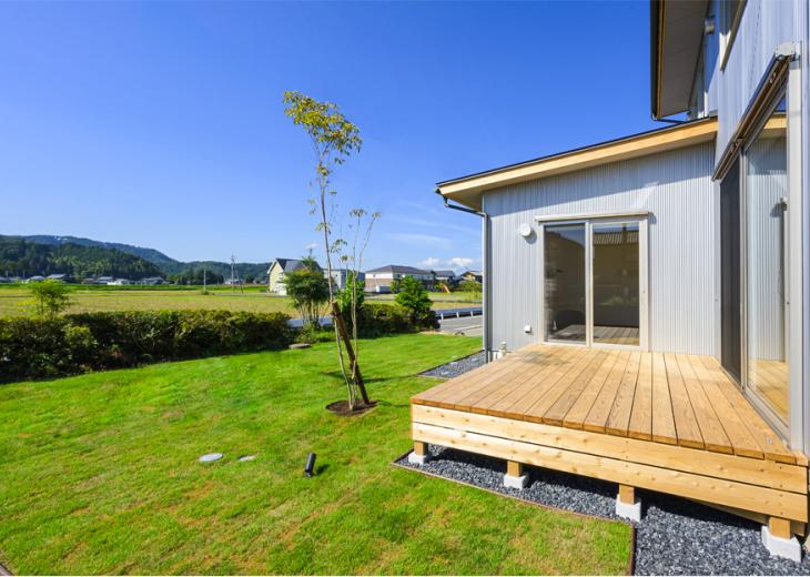 耐久性のあるガルバリウムと天然木を組み合わせた外観は、田園風景に馴染む落ち着いた佇まい。南側には植物好きな奥さまのための広い庭を配置し、リビングや個室から直接アクセスできる約4.5畳のウッドデッキは、晴れた日には第2のリビングとして、くつろぎの時間を過ごしていただけます。