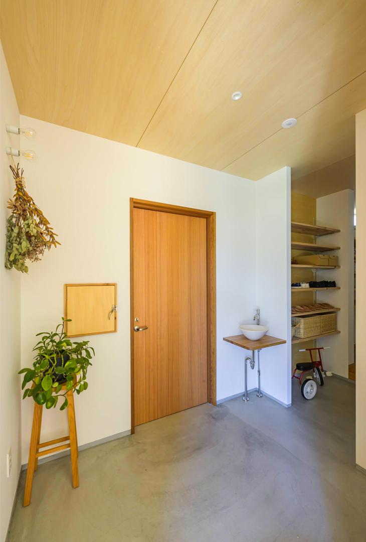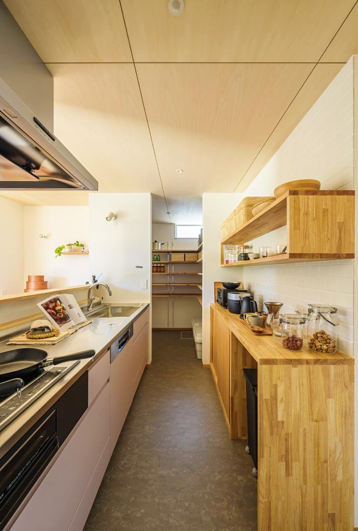 玄関からは、来客用と家事用に分けた動線を確保し、パントリーやキッチンへのアクセスもスムーズに。中央に配置されたキッチンからは、リビング・ダイニング全体を見渡せ、パントリーや洗面所へも円滑に移動ができます。吹き抜けのあるリビングや個室、2階の子供部屋やフリースペースは、全て、南面に窓を設け、日中も明るく、自然の景色が楽しめる心地よい空間となりました。また、家中に無垢材をふんだんに使用し、自然との触れ合いが好きなご家族にぴったりなお家です。